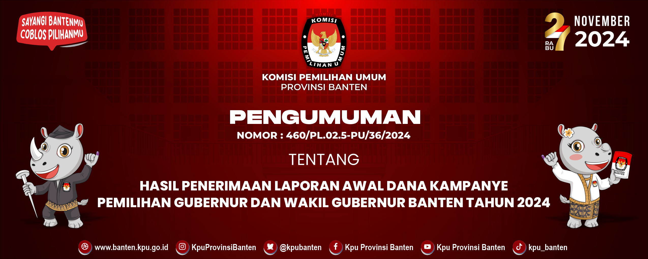 banten.kpu.go.id - 4 Okt 2024. Berdasarkan ketentuan Pasal 123 ayat (3) dan ayat (4) Peraturan Komisi Pemilihan Umum Nomor 8 Tahun 2024 tentang Pencalonan Gubernur dan Wakil Gubernur, Bupati dan Wakil Bupati, serta Walikota dan Wakil Walikota, KPU Provinsi Banten telah menetapkan Pasangan Calon Gubernur dan Wakil Gubernur, dengan Keputusan KPU Provinsi Banten Nomor 128 Tahun 2024 tentang Penetapan Nomor Urut Pasangan Calon Peserta Pemilihan Gubernur dan Wakil Gubernur Banten Tahun 2024 yang ditetapkan tanggal 23 September 2024, dengan ini mengumumkan Daftar Pasangan Calon Gubernur dan Wakil Gubernur Banten Tahun 2024.  KLIK DISINI PENGUMUMAN LEBIH LENGKAP
