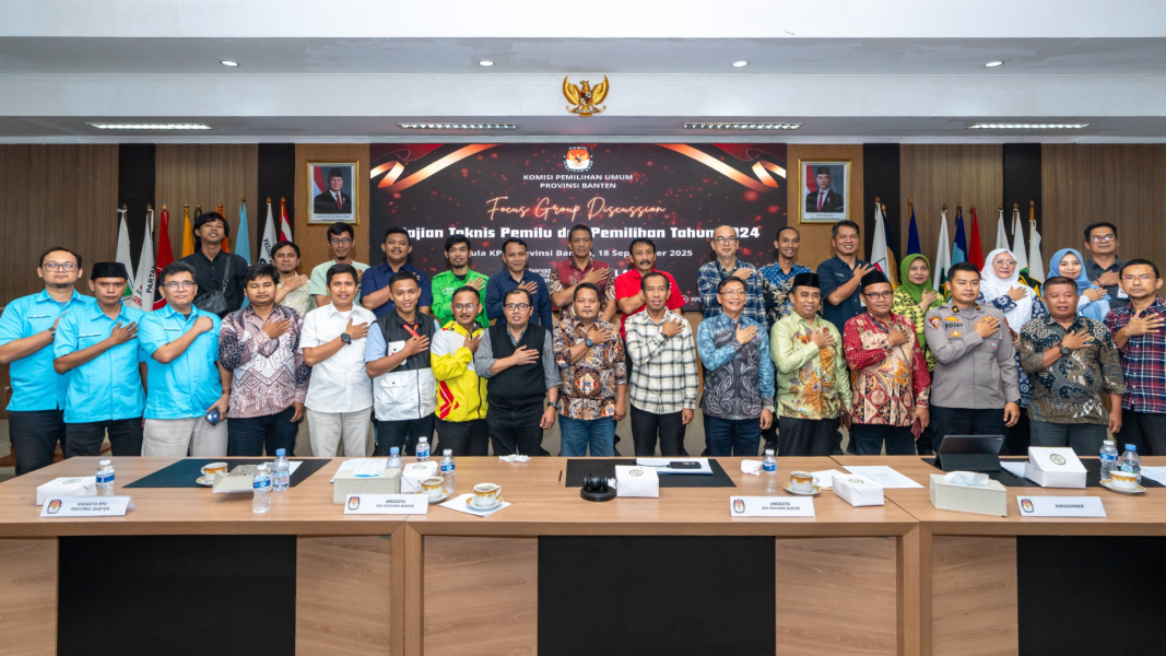 18 September 2025 - Komisi Pemilihan Umum Provinsi Banten menggelar Focus Group Discussion (FGD) Kajian Teknis Pemilu dan Pemilihan Tahun 2024 di Aula KPU Provinsi Banten. Kegiatan ini dihadiri Bawaslu Provinsi Banten, perwakilan partai politik, perguruan tinggi, pegiat pemilu dan instansi terkait sebagai bagian dari evaluasi penyelenggaraan Pemilu dan Pilkada 2024.
