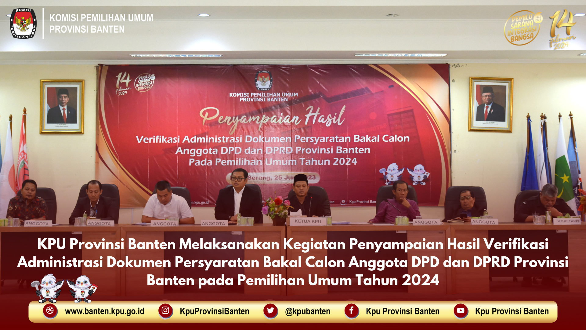 #Temanpemilih - KPU Provinsi Banten Melaksanakan Kegiatan Penyampaian Hasil Verifikasi Administrasi Dokumen Persyaratan Bakal Calon Anggota DPD dan DPRD Provinsi Banten pada Pemilihan Umum Tahun 2024, bertempat di Aula KPU Provinsi Banten, Minggu (25/06/2023). Kegiatan ini dihadiri oleh Ketua KPU Provinsi Banten, Mohamad Ihsan, Anggota KPU Provinsi Banten, Akhmad Subagja, M Agus Muslim, M Ali Zaenal Abidin, A Munawar, Ahmad Suja'i dan Aas Satibi beserta Sekretaris KPU Provinsi Banten, Ferry Syahminan, jajaran Kabag dan Kasubag beserta Operator di Sekretariat KPU Provinsi Banten dan dihadiri oleh Bakal Calon Anggota DPD beserta LO/Admin dan LO/Admin Partai Politik. Kegiatan dibuka oleh Mohamad Ihsan, dimana dalam sambutannya Ihsan menyampaikan kita telah menyelesaikan tahapan verifikasi administrasi bakal calon Anggota DPD dan DPRD Provinsi Banten dan hari ini akan disampaikan hasil dan Berita Acara verifikasi administrasi tersebut. Semoga catatan hasil pemeriksaan vermin ini dapat ditindaklanjuti oleh Lo bakal calon DPD maupun Lo Partai Politik untuk segera memperbaiki dan melengkapinya di masa perbaikan. Ihsan juga meminta kepada semua Lo untuk memanfaatkan layanan helpdesk yang telah disediakan KPU Provinsi Banten. Acara dilanjutkan dengan pengarahan Ahmad Subagja, selaku Ketua Divisi Teknis Penyelenggaraan Pemilu. Oha panggilan akrabnya, menjelaskan tentang proses pelaksanaan verifikasi administrasi yang dilaksanakan oleh Operator KPU Provinsi Banten. Kemudian Oha juga menerangkan beberapa catatan yang ditemukan dalam jalannya proses administrasi. Oha juga meminta kepada LO/Admin bakal calon pada tahapan penyampaian dokumen perbaikan untuk memperhatikan kesesuaian dokumen data setiap bakal calon, jangan sampai hingga berakhirnya masa perbaikan masih ditemukan catatan tidak lengkap dan tidak sesuai yang menyebabkan bakal calon mendapatkan status TMS. #pemiluserentak2024 #kpumelayani