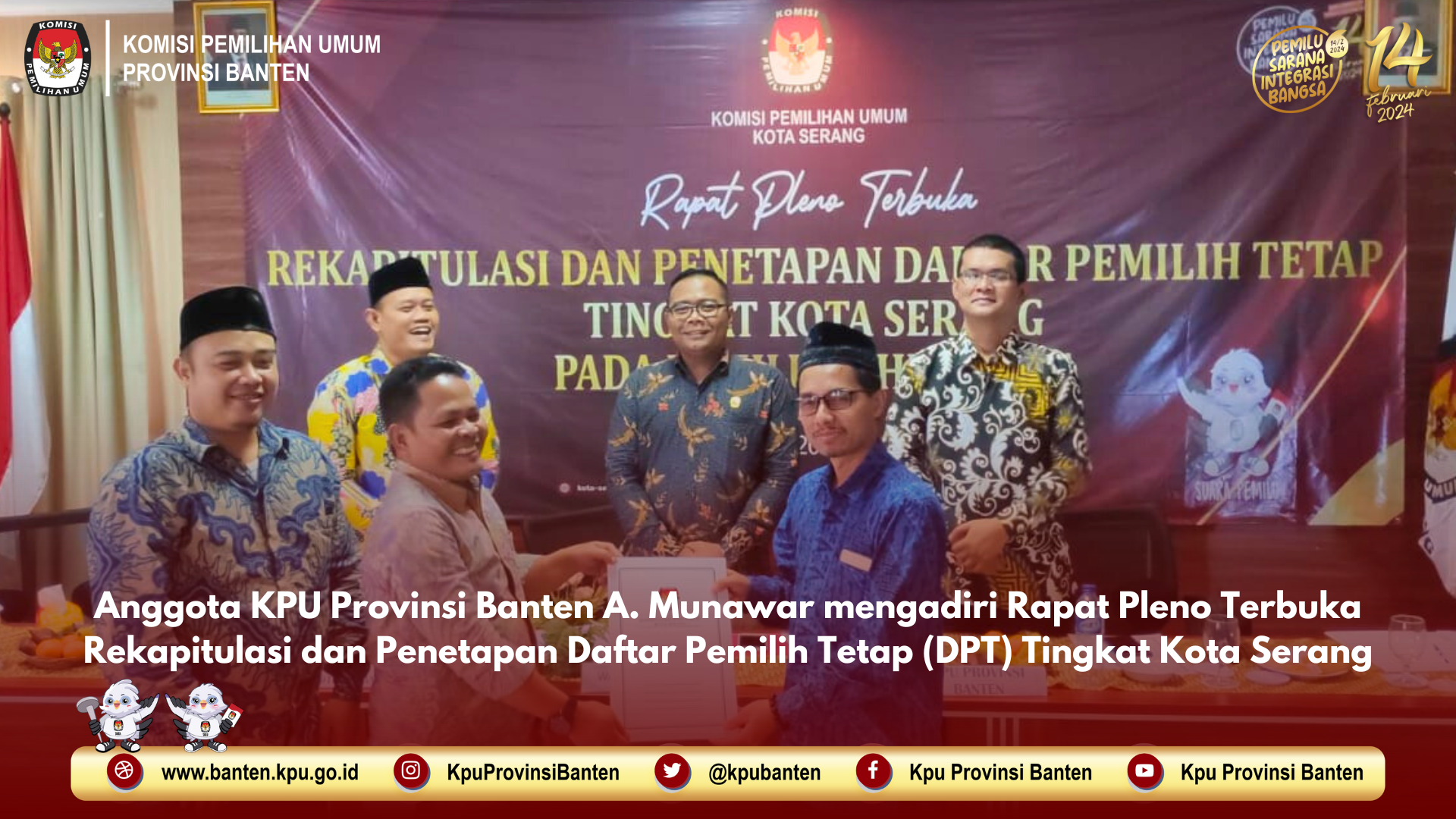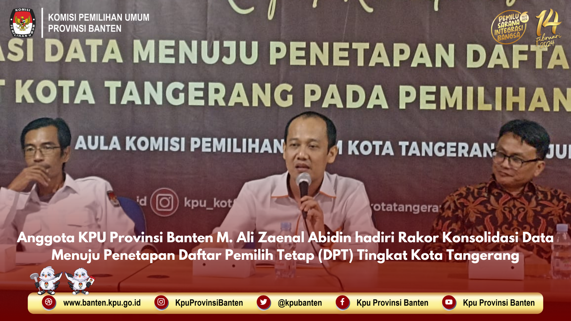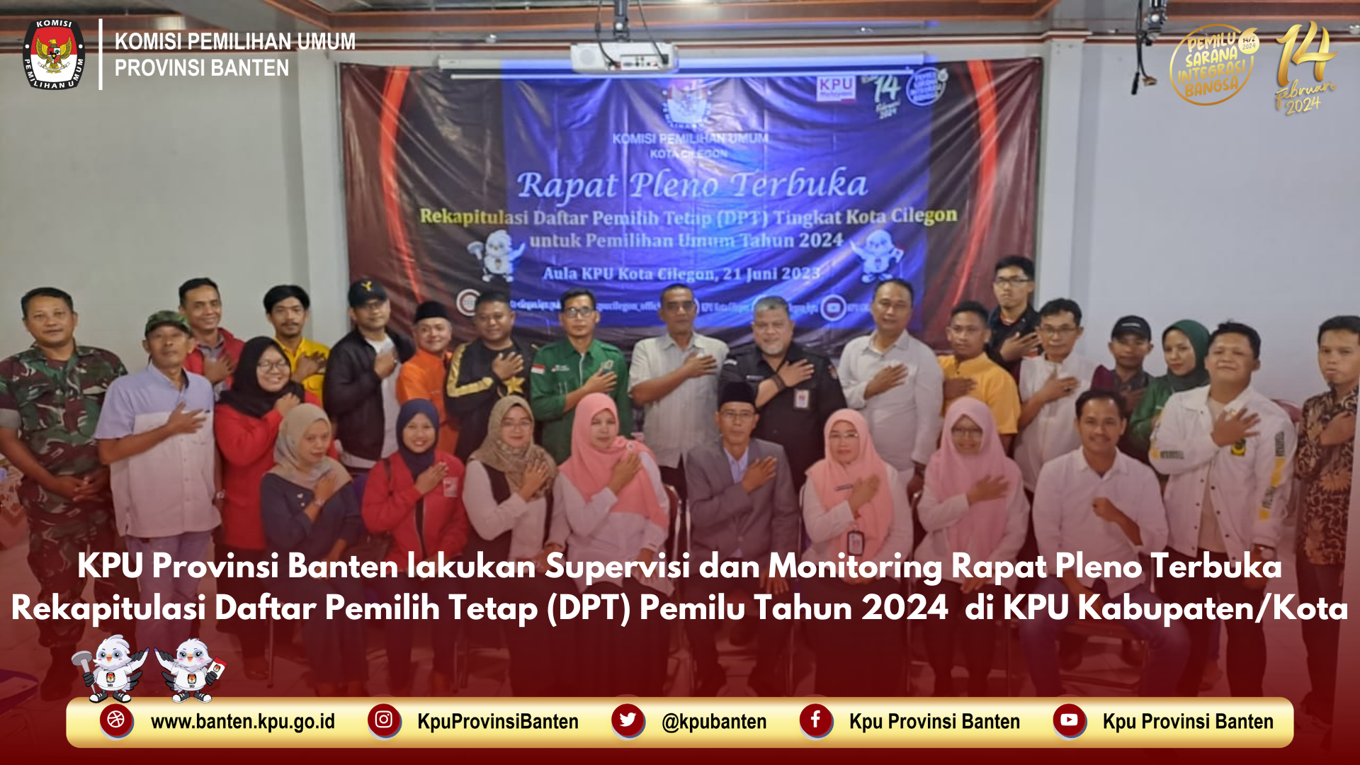 #temanpemilih Hari Rabu tanggal 21 Juni 2023 terdapat 6 (enam) KPU Kabupaten/Kota di wilayah kerja KPU Provinsi Banten yang melakukan Rapat Pleno Terbuka Rekapitulasi Daftar Pemilih Tetap (DPT) Pemilihan Umum Tahun 2024 yakni di KPU Kota Cilegon, KPU Kabupaten Pandeglang, KPU Kabupaten Lebak KPU Kabupaten Tangerang, KPU Kota Tangerang, dan KPU Kota Tangerang Selatan. Pelaksanaan Rekapitulasi DPT di Kabupaten/Kota diatur dalam ketentuan Pasal 103 Peraturan Komisi Pemilihan Umum Nomor 7 Tahun 2023 tentang Penyusunan Daftar Pemilih Dalam Penyelenggaraan Pemilihan Umum dan Sistem Informasi Data Pemilih dan ketentuan dalam Keputusan Komisi Pemilihan Umum Nomor 27 Tahun 2023 tentang Pedoman Teknis Penyusunan Daftar Pemilih Dalam Negeri Pada Penyelenggaraan Pemilihan Umum. Peserta Kegiatan Rapat Pleno Terbuka Rekapitulasi Daftar Pemilih Tetap (DPT) Pemilu 2024 terdiri dari PPK, Bawaslu Kabupaten/Kota, Partai Politik, TNI/Polri dan Perangkat Pemerintah tingkat Kabupaten/Kota. KPU Provinsi Banten melakukan supervisi dan monitoring terhadap kegiatan Rekapitulasi DPT di KPU Kabupaten/Kota yaitu Mohamad Ihsan Ketua KPU Provinsi Banten beserta Indhi Beniarto Kepala Sub Bagian Data dan Informasi dan Saeful Ulum Operator Sidalih KPU Provinsi Banten menghadiri kegiatan Rapat Pleno Terbuka Rekapitulasi Daftar Pemilih Tetap (DPT) Tingkat Kota Tangerang Selatan bertempat di Resto Hungry Hutt BSD City Kota Tangerang Selatan, Ahmad Sujaí Anggota KPU Provinsi Banten Ketua Divisi Perencanaan dan Logistik beserta Riana Laila Sari Kepala Sub Bagian Perencanaan dan Agus Diansyah pelaksana pada Sub Bagian Perencanaan menghadiri kegiatan Rapat Pleno Terbuka Rekapitulasi Daftar Pemilih Tetap (DPT) Tingkat Kabupaten Pandeglang bertempat di Rumah Makan 'S' Rizki Pandeglang Kabupaten Pandeglang, Aas Satibi Anggota KPU Provinsi Banten Ketua Divisi Sosilaisasi, Pendidikan Pemilih dan Partisipasi Masyarakat beserta Danny Widodo Uji Prakoso dan Isnaini Ayub pelaksana pada Sub Bagian Perencanaan menghadiri kegiatan Rapat Pleno Terbuka Rekapitulasi Daftar Pemilih Tetap (DPT) Tingkat Kabupaten Lebak bertempat di Hotel Mutiara Lebak Kabupaten Lebak, M. Ali Zaenal Abidin Anggota KPU Provinsi Banten Ketua Divisi SDM, Penelitian dan Pengembangan bersama Eka Rafianto pelaksana pada Sub Bagian Perencanaan menghadiri kegiatan Rapat Pleno Terbuka Rekapitulasi Daftar Pemilih Tetap (DPT) Tingkat Kabupaten Tangerang bertempat di hotel Yasmin Karawaci Kabupaten Tangerang, Akhmad Subagja Anggota KPU Provinsi Banten Ketua Divisi Teknis Penyelenggaraan bersama Fitri Intansari Operator Sidalih dan Nurjaman pelaksana Sub Bagian Data dan Informasi KPU Provinsi Banten menghadiri kegiatan Rapat Pleno Terbuka Rekapitulasi Daftar Pemilih Tetap (DPT) Tingkat Kota Tangerang bertempat di Kantor KPU Kota Tangerang serta Ferry Syahminan Sekretaris KPU Provinsi Banten dan Edy Handoko Kepala Bagian Perencanaan, Data dan Informasi KPU Provinsi Banten menghadiri kegiatan Rapat Pleno Terbuka Rekapitulasi Daftar Pemilih Tetap (DPT) Tingkat Kota Cilegon bertempat di Aula Kantor KPU Kota Cilegon. Rekapitulasi Daftar Pemilih Tetap (DPT) Tingkat Kota Tangerang Selatan menetapkan Rekapitulasi Daftar Pemilih Tetap (DPT) Kota Tangerang Selatan dengan Jumlah Kecamatan 7, Jumlah Desa/Kelurahan 54, Jumlah TPS 3.824, Pemilih Laki-Laki 501.755, Pemilih Perempuan 520.482 dan Jumlah Pemilih Laki-Laki dan Perempuan 1.022.237, Tingkat Kabupaten Pandeglang dengan Jumlah Kecamatan 35, Jumlah Desa/Kelurahan 339, Jumlah TPS 3.759, Jumlah pemilih Laki-Laki 511.805, Jumlah Pemilih Perempuan 484.322, Jumlah Pemilih Laki-Laki dan Perempuan 996.127, Tingkat Kabupaten Tangerang dengan Jumlah Kecamatan 29, Jumlah Desa/Kelurahan 274, Jumlah TPS 9.016, Jumlah Pemilih Laki-Laki 1.188.969, Jumlah Pemilih Perempuan 1.164.856 dan jumlah Pemilih Laki-Laki dan Perempuan 2.353.825, Tingkat Kabupaten Lebak dengan Jumlah Kecamatan 28, Jumlah Desa/Kelurahan 345, Jumlah TPS 3.995, Jumlah Pemilih Laki-Laki 537.915, Jumlah Pemilih Perempuan 510.728 dan Jumlah Pemilih Laki-Laki dan Perempuan 1.048.643, Tingkat Kota Cilegon Jumlah Kecamatan 8, Jumlah Kelurahan 43, Jumlah TPS 1.253, Jumlah Pemilih Laki-Laki 163.345, Jumlah Pemilih Perempuan 161.217 dan Jumlah Pemilih Laki-Laki dan Perempuan 324.562 dan Rekapitulasi Daftar Pemilih Tetap (DPT) Tingkat Kota Tangerang Jumlah Kecamatan 13, Jumlah Kelurahan 104, Jumlah TPS 5.175, Jumlah Pemilih Laki-Laki 678.001, Jumlah Pemilih Perempuan 684.772 dan Jumlah Pemilih Laki-Laki dan Perempuan 1.362.773. Kegiatan Rekapitulasi DPT di KPU Kabupaten/Kota diakhiri dengan penyampaian Salinan Berita Acara serta Keputusan KPU Kabupaten Kota tentang Penetapan Rekapitulasi Daftar Pemilih Tetap Tingkat Kabupaten/Kota dalam Penyelenggaraan Pemilihan Umum Tahun 2024 kepada Peserta Rapat Pleno.