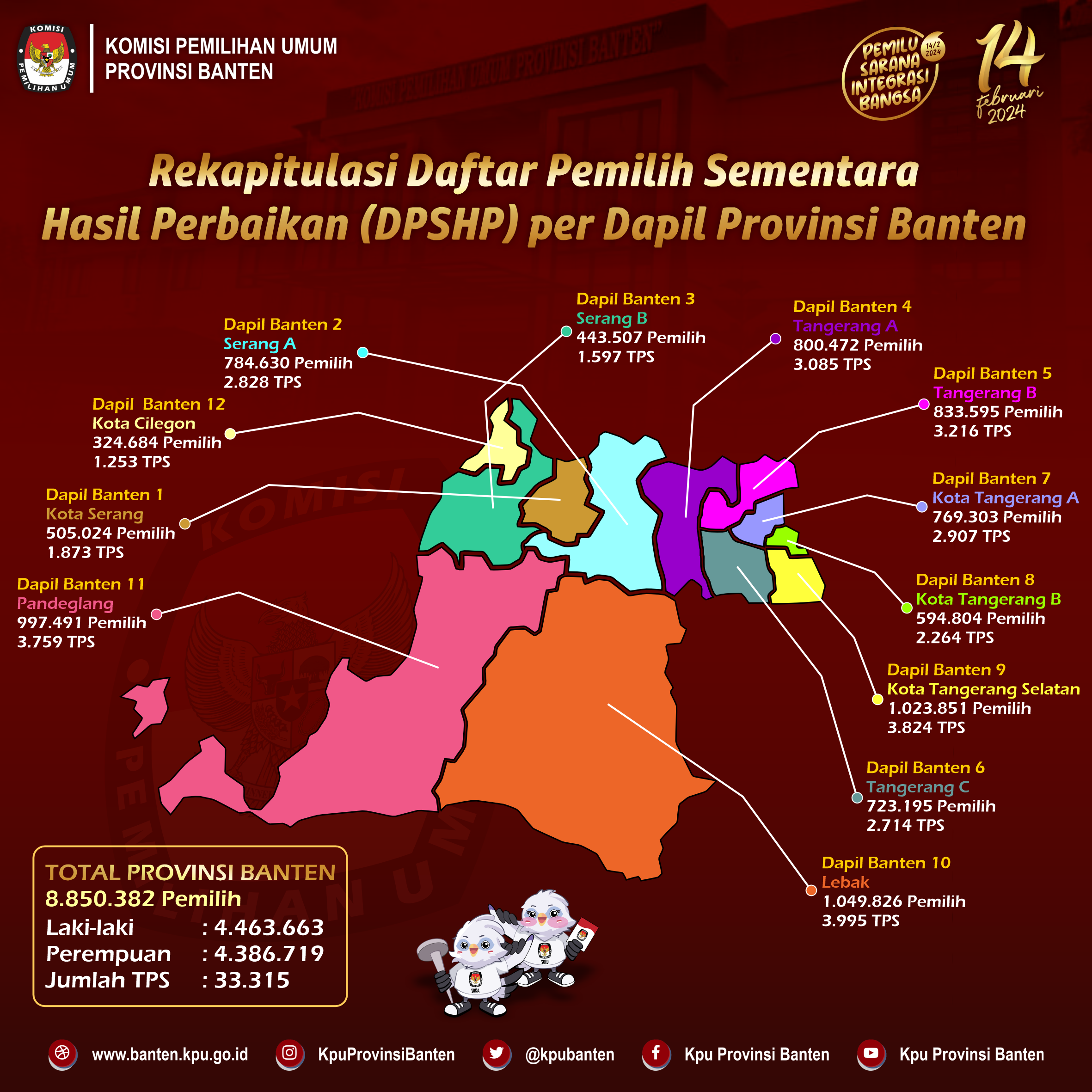 Progres pemutakhiran data pemilih sampai saat ini ada di tahapan Daftar Pemilih Sementara Hasil Perbaikan (DPSHP) dimana terdapat 33.315 TPS yang tersebar di 8 Kabupaten/Kota Se Provinsi Banten, dengan jumlah pemilih sejumlah 8.850.382 dengan rincian pemilih laki-laki sejumlah 4.463.663 dan pemilih perempuan sejumalh 4.386.719.