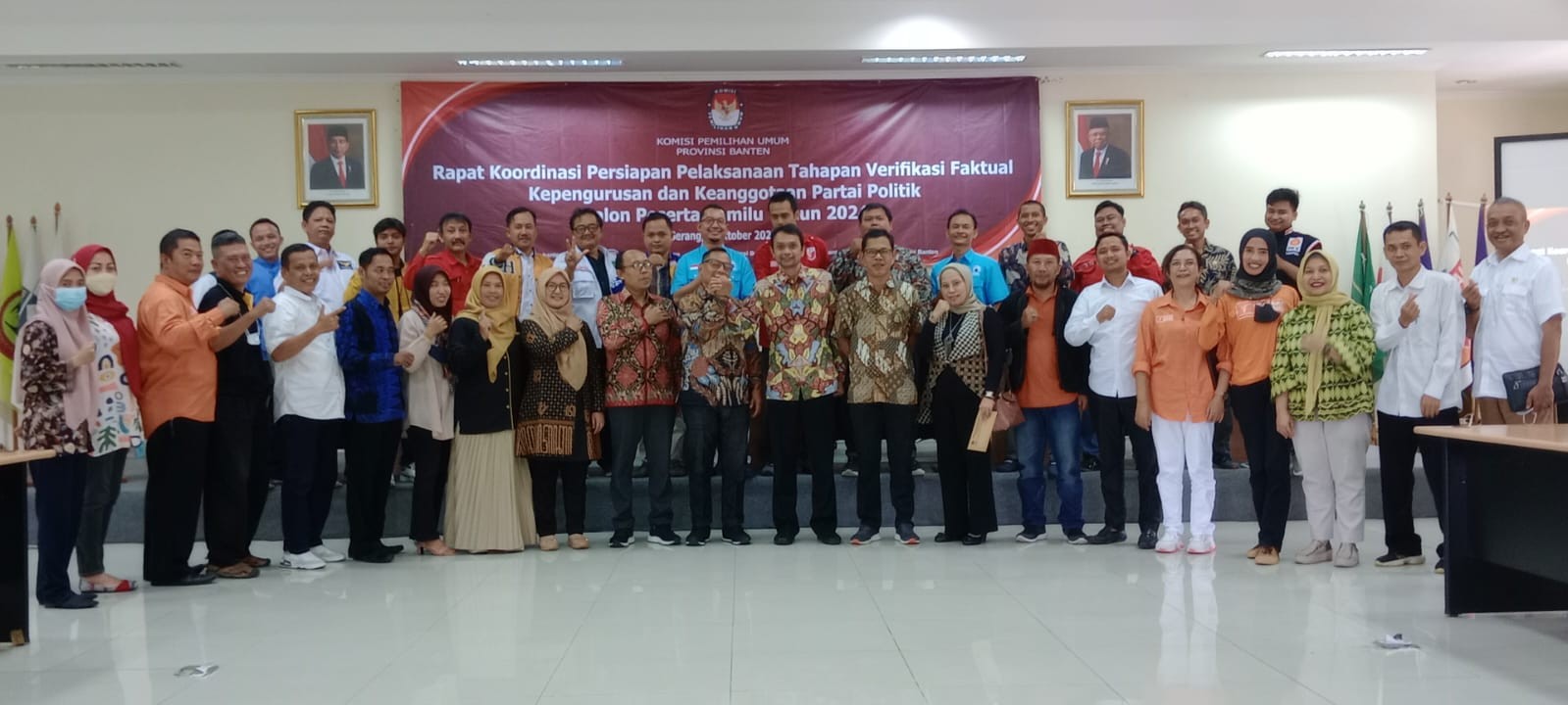 KPU BANTEN - Pada hari ini (7/10) KPU Banten mengadakan Rapat Koordinasi Persiapan Pelaksanaan Tahapan Verifikasi Faktual Kepengurusan dan Keanggotaan Partai Politik Calon Peserta Pemilu Tahun 2024 bertempat di Aula Kantor KPU Provinsi Banten. Sebagai peserta kegiatan pada hari ini adalah 24 Partai Politik Calon Peserta Pemilu Tahun 2024 yang diwakili oleh 2 orang. Tampak hadir Ketua KPU Provinsi Banten Wahyul Furqon, Jajaran Anggota KPU Provinsi Banten Nurkhayat Santosa, Rohimah, H. Agus Sutisna, Ramelan, Masudi, Eka Satialaksmana, Sekretaris KPU Provinsi Banten Ferry Syahminan beserta Para Kepala Bagian, Para Kepala Sub Bagian, dan Pelaksana KPU Provinsi Banten. Adapun tujuan diadakannya kegiatan ini adalah untuk mempersiapkan Pelaksanaan Tahapan Verifikasi Faktual Kepengurusan dan Keanggotaan Partai Politik yang akan dilangsungkan pada tanggal 15 sampai dengan 17 Oktober 2022. Wahyul Furqon menyatakan kegiatan ini dianggap perlu untuk menjelaskan beberapa catatan penting untuk mempersiapkan verifikasi faktual nantinya. Upaya pemenuhan segala persyaratan mungkin telah dilakukan oleh partai politik dan dalam kegiatan ini nantinya akan kita kupas lebih dalam mengenai apa saja yang akan disiapkan dan dilakukan oleh Partai Politik dalam Tahapan Verifikasi Faktual nanti. Sekali lagi saya mengingatkan bahwa KPU Provinsi Banten sudah menyiapkan helpdesk untuk menunjang pelaksanaan tahapan pemilu. Pemaparan Materi Oleh Anggota Divisi Teknis Penyelenggaraan KPU Provinsi Banten Masudi dengan judul materi Pelaksanaan Verifikasi Faktual Kepengurusan dan Keanggotaan Partai Politik Calon Peserta Pemilu Tahun 2024. Kegiatan ini merupakan tindak lanjut dari kegiatan sebelumnya yang mana dalam verifikasi faktual apa saja yang perlu kita siapkan dan apa saja yang akan kita lakukan. Karena dalam verifikasi faktual nanti akan melihat secara langsung ke lapangan untuk memeriksa kebenaran datanya. Berdasarkan Putusan MK Nomor 55 Tahun 2021 terhadap partai politik yang memenuhi batas ambang parlemen 4% hanya dilakukan Verifikasi Administrasi saja tidak dilakukan Verifikasi Faktual. Sehingga untuk 9 Partai baru maupun partai lama non parlemen akan dilakukan verifikasi faktual untuk menentukan lolos tidaknya partai politik sebagai peserta pemilu tahun 2024.