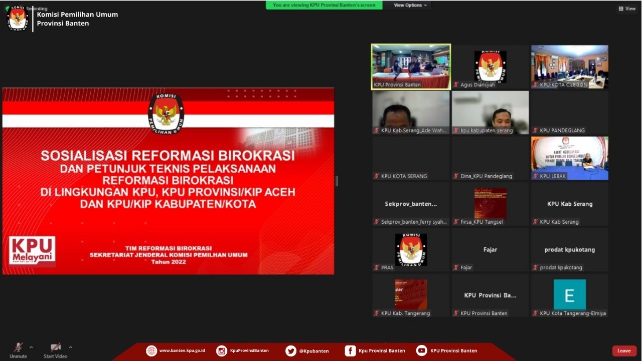 KPU Banten - Pada hari ini (12/07) melalui Zoom Cloud Meeting KPU Banten mengadakan kegiatan Sosialisasi Pengisian Lembar Kerja Evaluasi (LKE) Penilaian Mandiri Pelaksanaan Reformasi Birokasi (PMPRB) di Lingkungan KPU Kabupaten/Kota Se-Provinsi Banten. Nampak hadir sebagai peserta Sekretaris, Kepala Sub Bagian Perencanaan Data dan Informasi KPU Kabupaten/Kota. Kegiatan yang dibuka oleh Sekretaris KPU Provinsi Banten, Ferry Syahminan, menyampaikan bahwa kegiatan hari ini merupakan tindaklanjut dari intruksi KPU RI untuk memberikan sosialisasi kepada KPU Kabupaten/Kota terkait penilaian Reformasi Birokrasi. Lembar Kerja Evaluasi ini merupakan bentuk formal dari pelaksanakan Reformasi Birokrasi di tingkat satker, dan harus dilakukan evaluasi berkala. KPU Kabupaten/Kota harus melaporkan hasil penilaian Reforamsi Birokrasi ke KPU RI melalui KPU Provinsi. Acara kemudian dilanjutkan pemaparan materi oleh Edy Handoko, Kepala Bagian Perencanaan, Data dan Informasi dengan didampingi oleh Riana Laila Sari, Kepala Sub Bagian Perencanaan KPU Provinsi Banten. Kegiatan dilanjutkan dengan sesi diskusi dan tanya jawab. Kemudian ditutup oleh Edy Handoko Kepala Bagian Perencanaan, Data dan Informasi, mewakili Sekretaris KPU Provinsi Banten, beliau berharap bahwa KPU Kabupaten/Kota dapat memaksimalkan pengisian LKE dan menyampaikan hasil penilaian ke KPU Provinsi tidak melebihi tenggat waktu yang telah disepakati.