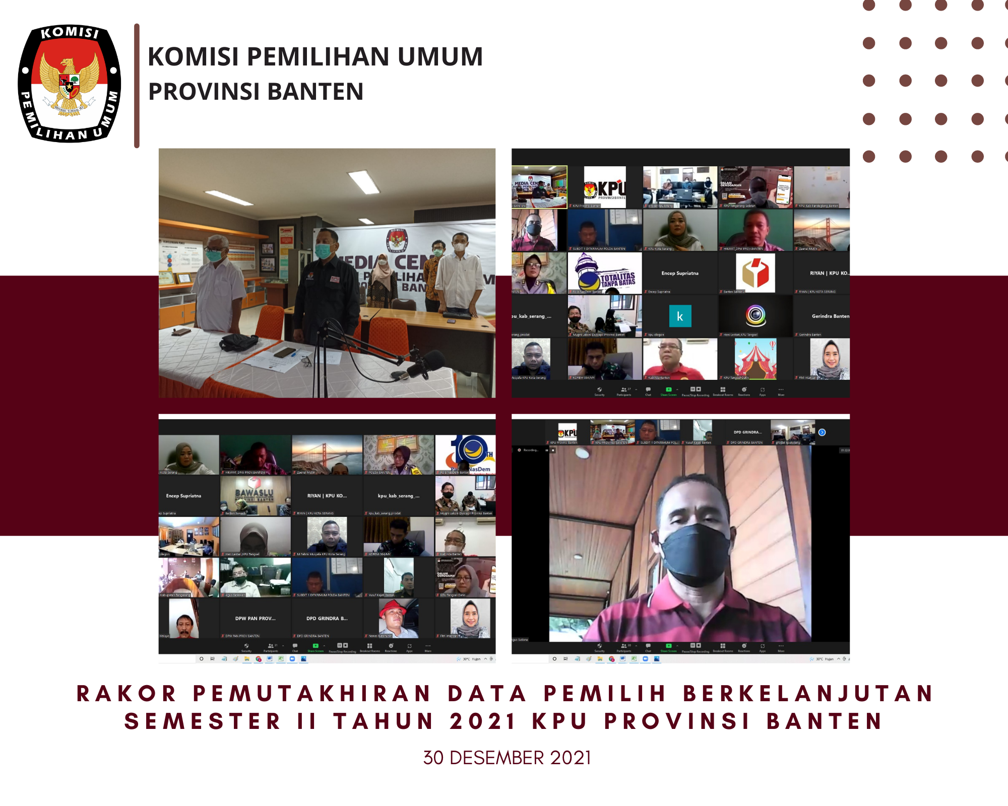 KPU Provinsi Banten mengadakan kegiatan Sosialisasi Peraturan Komisi Pemilihan Umum Nomor 6 Tahun 2021 tentang Pemutakhiran Data Pemilih Berkelanjutan (PDPB) melalui media zoom cloud meeting. Kegiatan dihadiri oleh Pimpinan Partai Politik tingkat Provinsi Banten, Bawaslu Provinsi Banten, Jajaran Instansi terkait dan Organisasi Masyarakat. (13/01) Ketua KPU Provinsi Banten, Wahyul Furqon, dalam sambutan dan pembukaan acara ini menyampaikan bahwa meskipun tidak dalam tahapan Pemilu/Pemilihan KPU tetap bekerja. Salah satunya adalah KPU selalu memutakhirkan data pemillih secara berkelanjutan. “Pada hari ini KPU Banten akan mensosialisasikan PKPU 6 tentang Pemutakhiran Data Pemilih Berkelanjutan, selama ini KPU Banten selalu melibatkan Stakeholder dalam proses pemutakhiran data Pemilih Berkelanjutan“, ungkap Wahyul Furqon. Wahyul menambahkan bahwa PKPU 6 Tahun 2021 ini adalah PKPU baru yang menjadi turunan dari Undang-Undang Nomor 7 Tahun 2017. Tujuan PDPB adalah memelihara, memperbarui dan mengevaluasi data pemilih pemilu terakhir secara terus menerus dan berkelanjutan yang digunakan untuk Pemilu/Pemilihan berikutnya. KPU Provinsi Banten sangat mengapresiasi partisipasi segala pihak yang turut aktif dalam pemutakhiran data pemilih berkelanjutan sehingga melahirkan data pemilih yang mutakhir dan akuntabel. Selanjutnya H. Agus Sutisna, Koordinator Divisi Data dan Informasi yang dimoderatori oleh Edy Handoko, Kepala Bagian Perencanaan, Data dan Informasi, memaparkan tentang PKPU Nomor 6 Tahun 2021 mengenai Pemutakhiran Data Pemilih Berkelanjutan. Materi yang disampaikan meliputi prinsip dalam PDPB di antaranya adalah inklusif yang berarti melibatkan semua pihak dan juga prinsip perlindungan data pribadi. Agus Sutisna juga memaparkan pembagian tugas, wewenang dan tanggung jawab secara hierarkis antara KPU RI, KPU Provinsi dan KPU Kabupaten/Kota. Kemudian juga dijelaskan alur terkait proses PDPB. Selain itu dibahas juga mengenai perubahan paradigma dalam pemutakhiran data, yang sebelumnya Periodic List menjadi Continous List dengan terus merawat data pemilih secara berkelanjutan yang sebelumnya data pemilih tidak dirawat lagi setelah selesai tahapan Pemilu/Pemilihan. Acara dilanjutkan dengan sesi tanggapan dan tanya jawab. Wakil Ketua DPRD Provinsi Banten, Budi Prajogo, menyampaikan tanggapan bahwa yang dilakukan oleh KPU Provinsi Banten dalam memutakhirkan data pemilih cukup baik, Budi berharap pemutakhiran data dapat dilakukan secara transparan dan menjaga kerahasiaan data pribadi, kemudian dengan adanya data yang berkelanjutan tentu akan memudahkan pelaksanaannya dengan adanya data yang single. Data pemilih sangat penting karena basis dari suara adalah akurasi data yang dimiliki KPU. Kemudian, Kepala Badan Kesatuan Bangsa dan Politik Provinsi Banten, Ade Ariyanto yang pada kegiatan ini mewakili Gubernur Banten menyampaikan bahwa Pemerintah Provinsi Banten mengapresiasi dan mendukung kegiatan yang terus berkesinambungan, dan semangat bersama dalam penyelenggaraan pemilu ke depan persoalan terkait data pemilih dapat diantisipasi, beliau juga menyampaikan harapan mudah-mudahan dengan panjangnya proses pemutakhiran data pemilih ini semua pihak dapat saling melengkapi dan menyempurnakan. Tak lupa beberapa partai politik dan peserta rapat menyampaikan masukan serta tanggapan mengenai PKPU 6 Tahun 2021, hal ini tidak lain untuk menghasilkan data pemilih yang akurat, mutakhir, dan berkualitas untuk pelaksanaan Pemilu/Pemilihan kedepannya. Kegiatan ditutup oleh Ketua KPU Provinsi Banten, Wahyul Furqon “Saya sampaikan rasa terima kasih kepada semua pihak atas saran dan masukan, tentunya ini akan menjadi bahan perbaikan untuk KPU Provinsi Banten karena KPU ingin mendapatkan data pemilih yang akurat dan dapat dipertanggungjawabkan, selain itu harapan yang diinginkan oleh KPU adalah persoalan terkait data pemilih dalam Pemilu/Pemilihan tidak terjadi lagi“, pungkasnya.