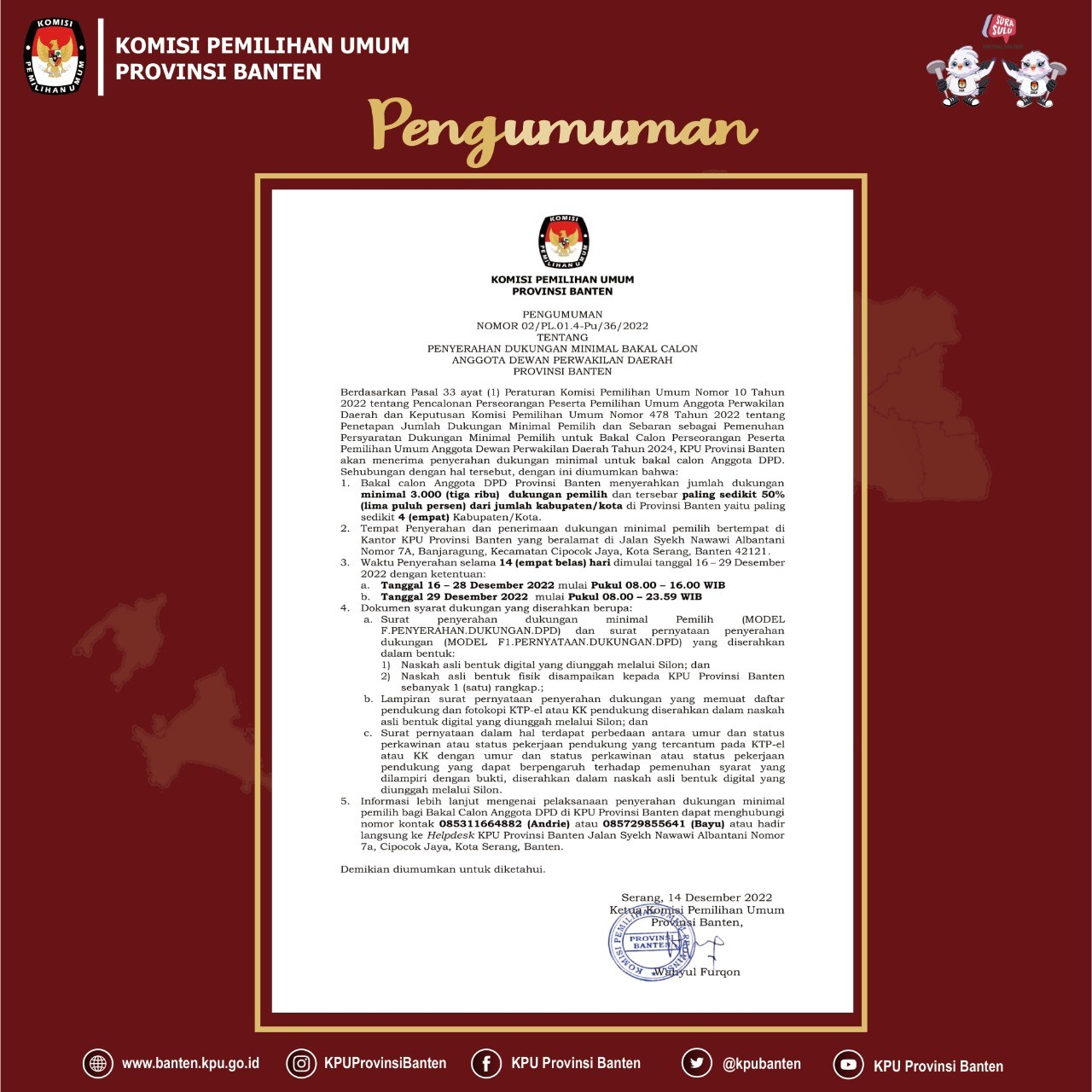 PENYERAHAN DUKUNGAN MINIMAL BAKAL CALON ANGGOTA DEWAN PERWAKILAN DAERAH PROVINSI BANTEN Rabu, 14 Desember 2022 07:00 154 klik disini untuk melihat pengumuman Baca Selengkapnya