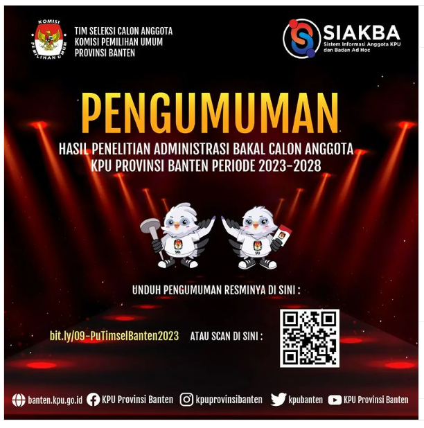Pengumuman Hasil Penelitian Administrasi Bakal Calon Anggota KPU Provinsi Banten Periode 2023-2028 Kamis, 02 Maret 2023 13:00 483 PENGUMUMAN HASIL SELEKSI ADMINISTRASI DAPAT DI KLIK DISINI Baca Selengkapnya