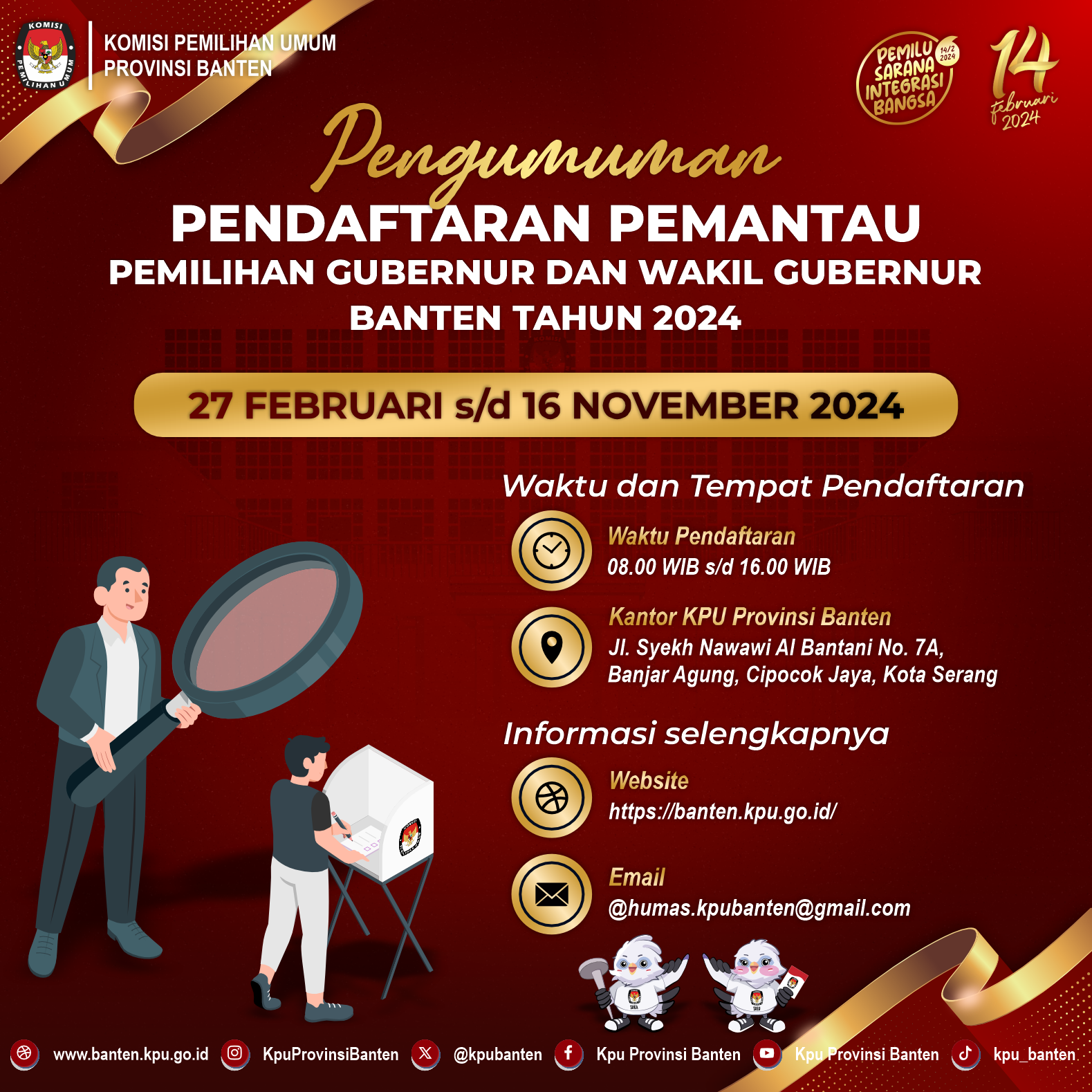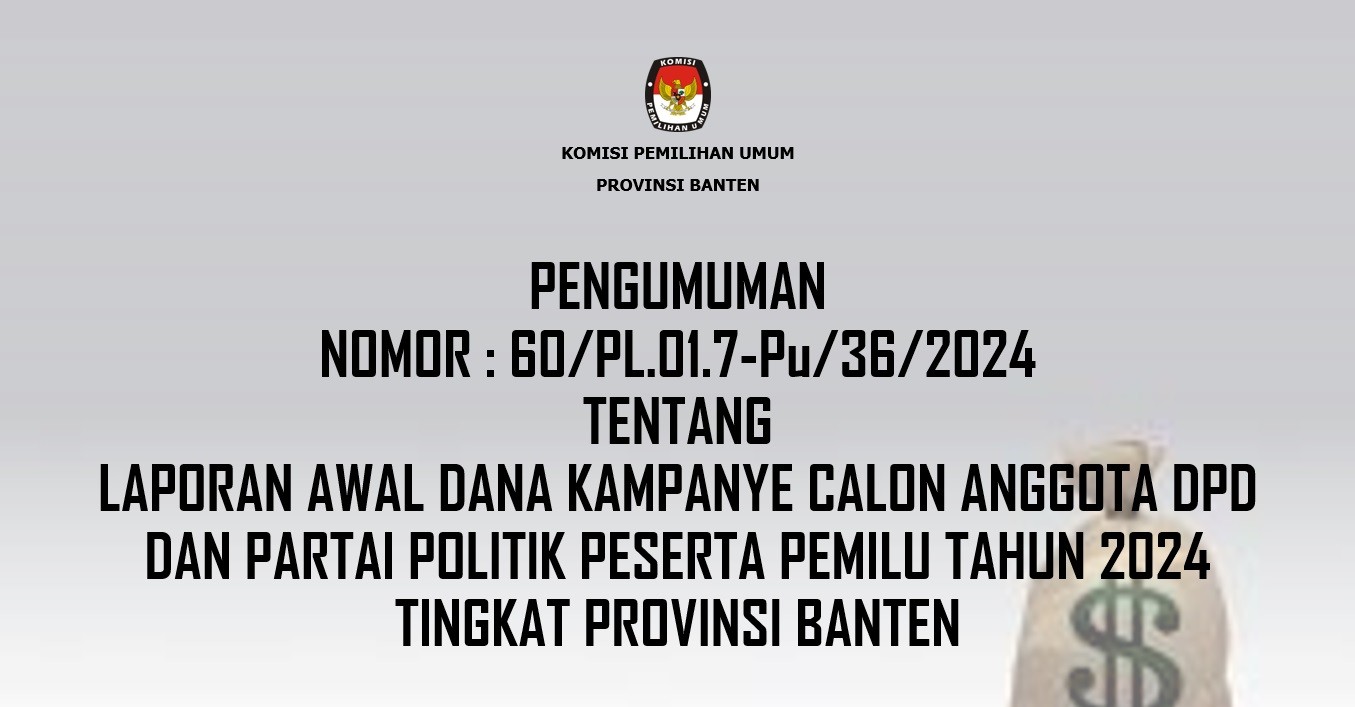 banten.kpu.go.id - 13 Januari 2024. Berdasarkan ketentuan Pasal 88 Peraturan KPU Nomor 18 Tahun 2023 Tentang Dana Kampanye Pemilohan Umum, bahwa KPU, KPU Provinsi, dan KPU Kabupaten/Kota mengumumkan LADK paling lambat 1 (satu) Hari setelah periode penerimaan LADK perbaikan berakhir sebagaimana dimaksud dalam Pasal 85 ayat (1) pada papan pengumuman dan laman KPU, KPU Provinsi, dan KPU Kabupaten/Kota. sehubungan dengan ketentuan tersebut KPU Provinsi Banten dengan ini mengumumkan LADK yang disampaikan oleh peserta Pemilihan Umum Tingkat Provinsi Banten, sebagai berikut: